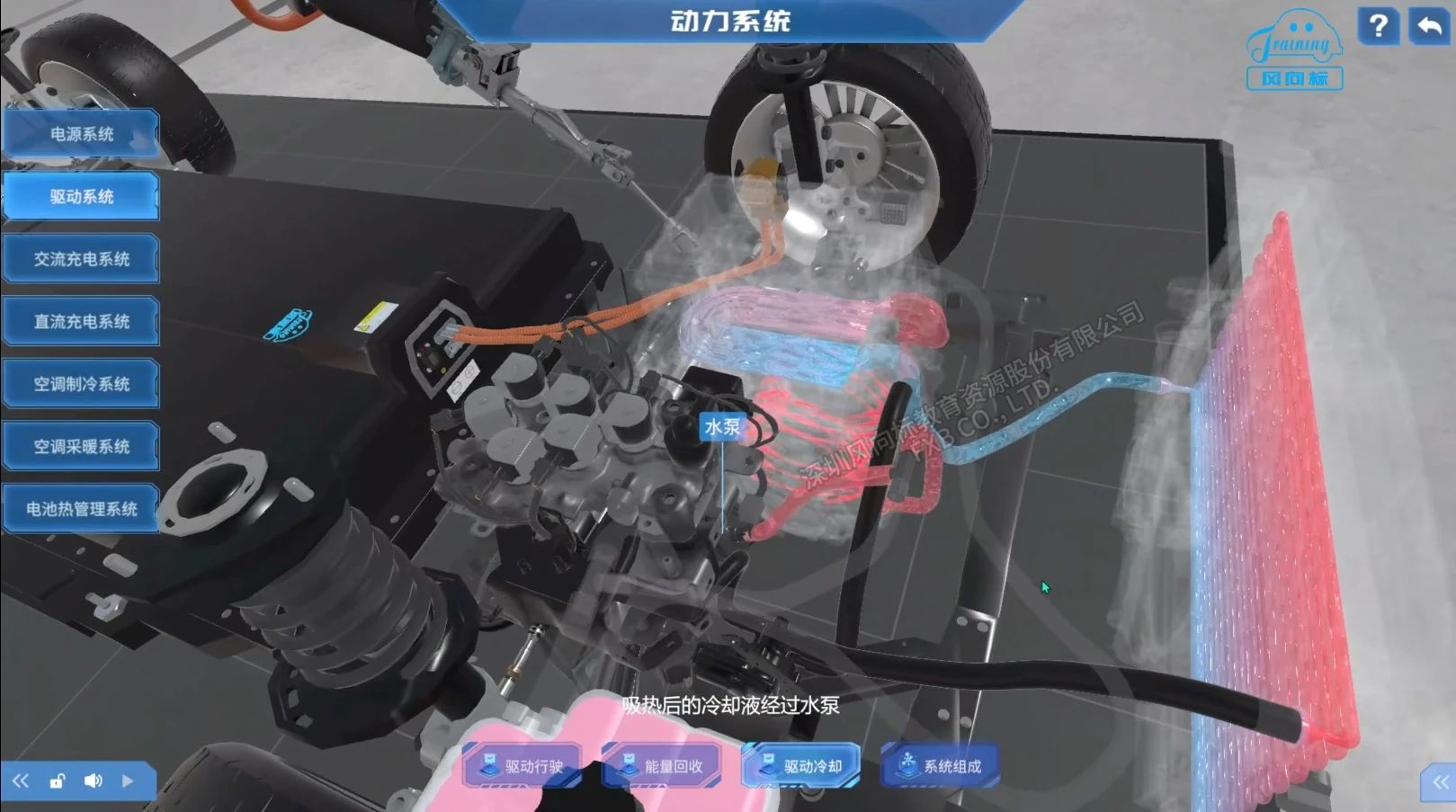 軟件基于比亞迪秦PLUS EV的動力系統(tǒng)結(jié)構(gòu)原理開發(fā),利用3D仿真技術(shù)實現(xiàn)高精度建模,提供了沉浸式的虛擬教學環(huán)境,在輔助教學的同時,幫助學生快速掌握純電汽車動力系統(tǒng)的結(jié)構(gòu)組成及工作原理。產(chǎn)品介紹場景中展示了部分虛化與部分實體相結(jié)合的模型結(jié)構(gòu),支持自由放大縮小,拖動旋轉(zhuǎn)觀察結(jié)構(gòu)之間的位置關(guān)系。三維動畫會講解工作原理,例如動力系統(tǒng)運行時的機械運動特效、電路傳遞特效、液體氣體特效等。在結(jié)構(gòu)展示頁,雙擊部