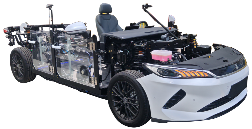 選用比亞迪秦PLUS-EV智駕版車輛制做在不改變原始汽車主體布局的情況下對其進行深度改裝,并且所有車身外罩均被拆除;在不改變原始汽車主體布局的情況下對其進行深度改裝,并且所有車身外罩均被拆除;該產(chǎn)品的主體是原車部件,是基于對整車零部件的認知設(shè)計而成,清晰的展示純電動轎車的核心結(jié)構(gòu);真實的展示了動力域控制器(含DC/DC轉(zhuǎn)換器、車載充電器OBC、電池管理器BMS、高壓配電箱PDU、整車控制器VCU、電機控制器等),電池總成系統(tǒng),后車身控制系統(tǒng),左車身控制系統(tǒng),右車身控制系統(tǒng),檔位控制器,組合儀表,交流充電口,直流充電口,散熱風(fēng)扇,冷卻水箱,電動壓縮機,PTC加熱模塊,空調(diào)蒸發(fā)箱,空調(diào)熱管理集成模塊,前懸架減震,后橋減震,車輪,轉(zhuǎn)向管柱,齒輪齒條式方向機,電動助力轉(zhuǎn)向器,電動助力控制模塊,前后燈光系統(tǒng),門鎖系統(tǒng),車窗系統(tǒng),倒車雷達及影像系統(tǒng)主要零部件的布局;形象的表達了純電動三電系統(tǒng)的結(jié)構(gòu)組成與工作原理充分展示出汽車各個零部件的全方位角度;