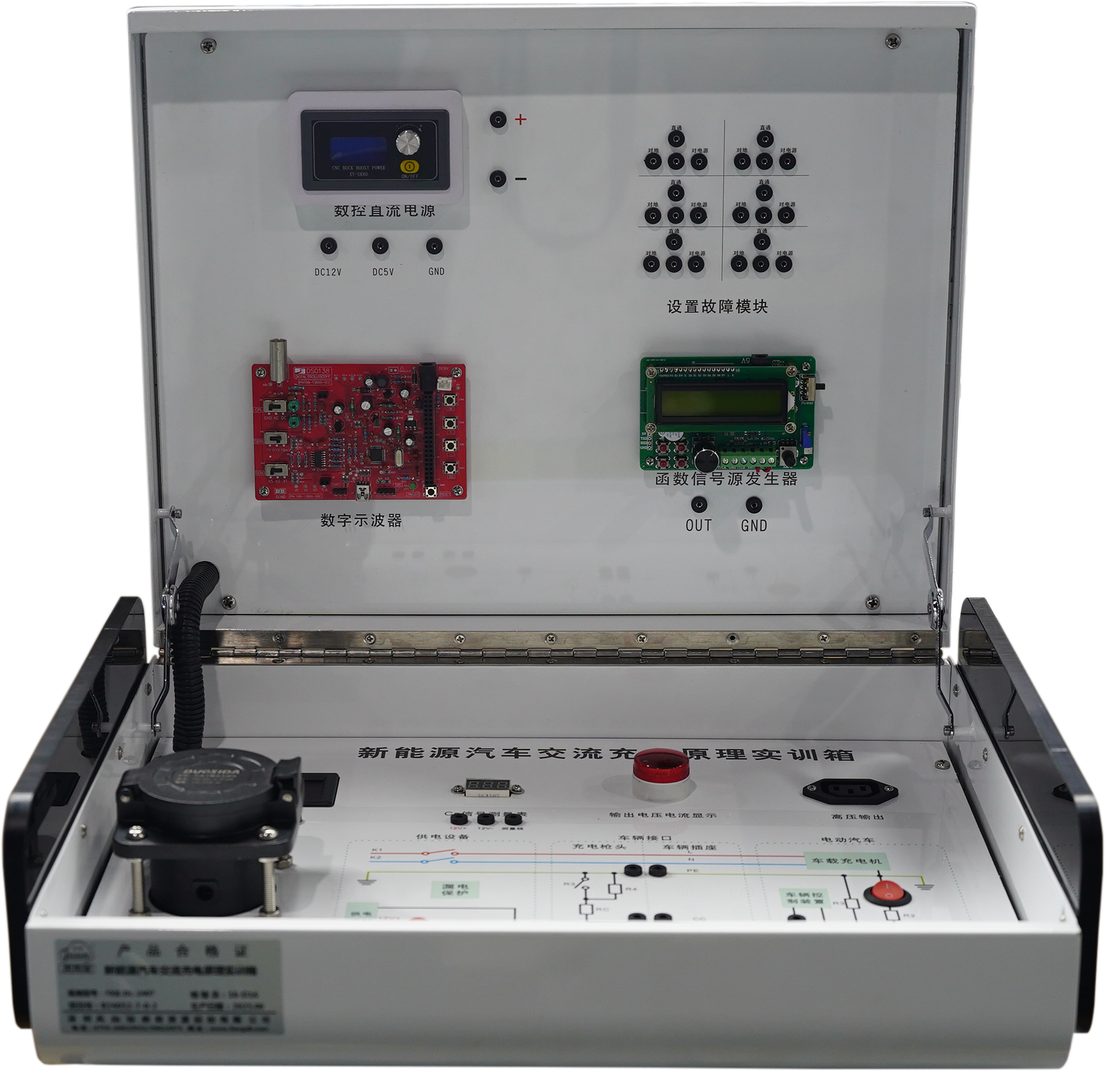 1. 實訓箱以新能源汽車為基礎,模擬顯示新能源汽車的工作原理2.實訓箱配備彩色數(shù)字電表,數(shù)字電表實時顯示CP信號電壓的變化以及CC的電阻;3.可用萬用表進行電阻的測量,觀察CC電阻隨著按鈕的變化而變化;4.可用萬用表進行電壓的測量,觀察其電壓隨著CP信號的變化;5.可用示波器進行波形的測量,測量CP信號6.可進行機械開關(guān)S1、S2的通斷,演繹新能源汽車交流充電的過程;7.設有機械設故按鈕,演繹新能